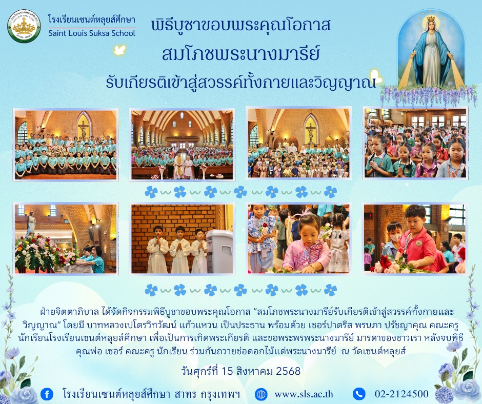 ฝ่ายจิตตาภิบาล ได้จัดกิจกรรมพิธีบูชาขอบพระคุณโอกาส “สมโภชพระนางมารีย์รับเกียรติเข้าสู่สวรรค์ทั้งกายและวิญญาณ”โดยมี บาทหลวงเปโตรวิทวัฒน์ แก้วแหวน เป็นประธาน พร้อมด้วย เซอร์ปาตริส พรนภา ปรัชญาคุณ คณะครู นักเรียนโรงเรียนเซนต์หลุยส์ศึกษา เพื่อเป็นการเทิดพระเกียรติ และขอพระพรพระนางมารีย์ มารดาของชาวเรา หลังจบพิธี คุณพ่อ เซอร์ คณะครู นักเรียน ร่วมกันถวายช่อดอกไม้แด่พระนางมารีย์ ในวันศุกร์ที่ 15 สิงหาคม 2568 ณ วัดเซนต์หลุยส์